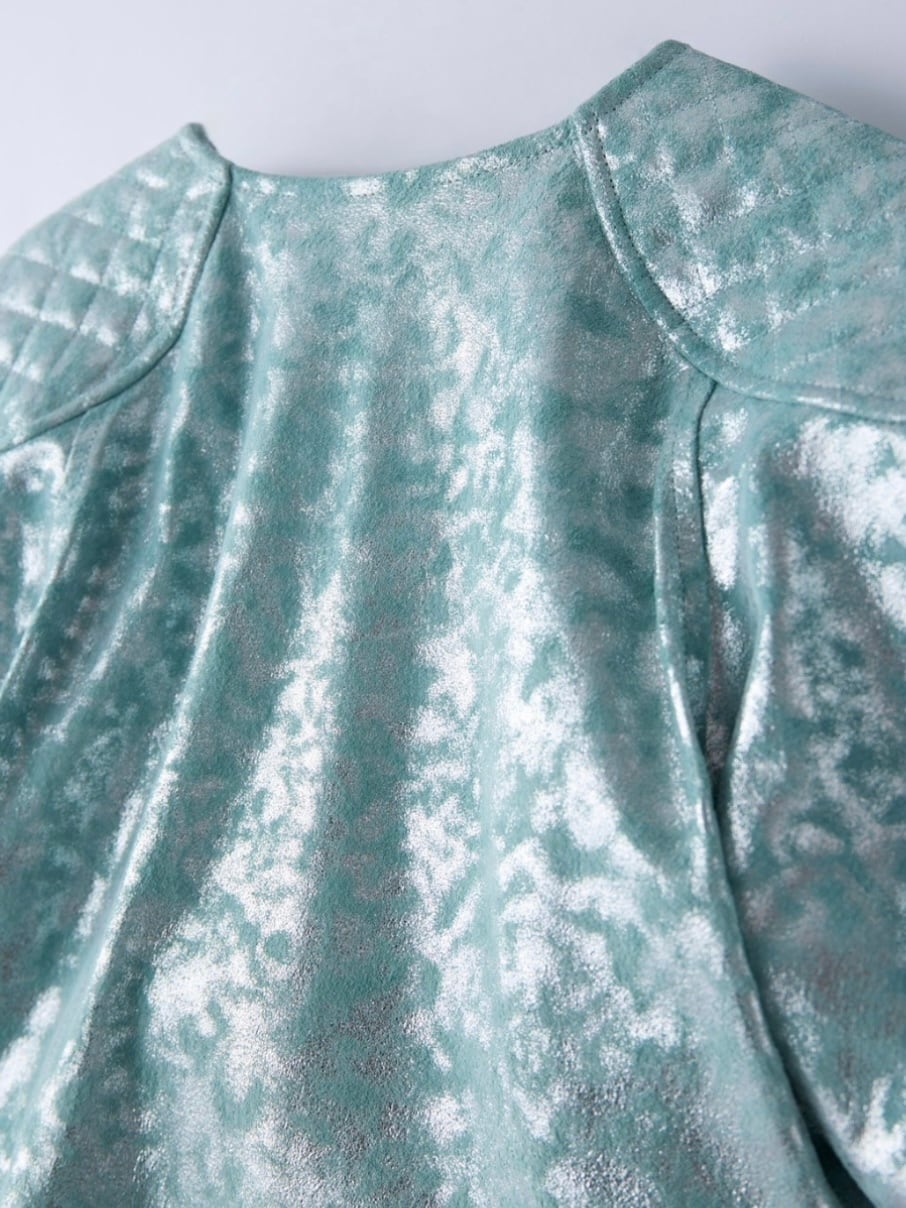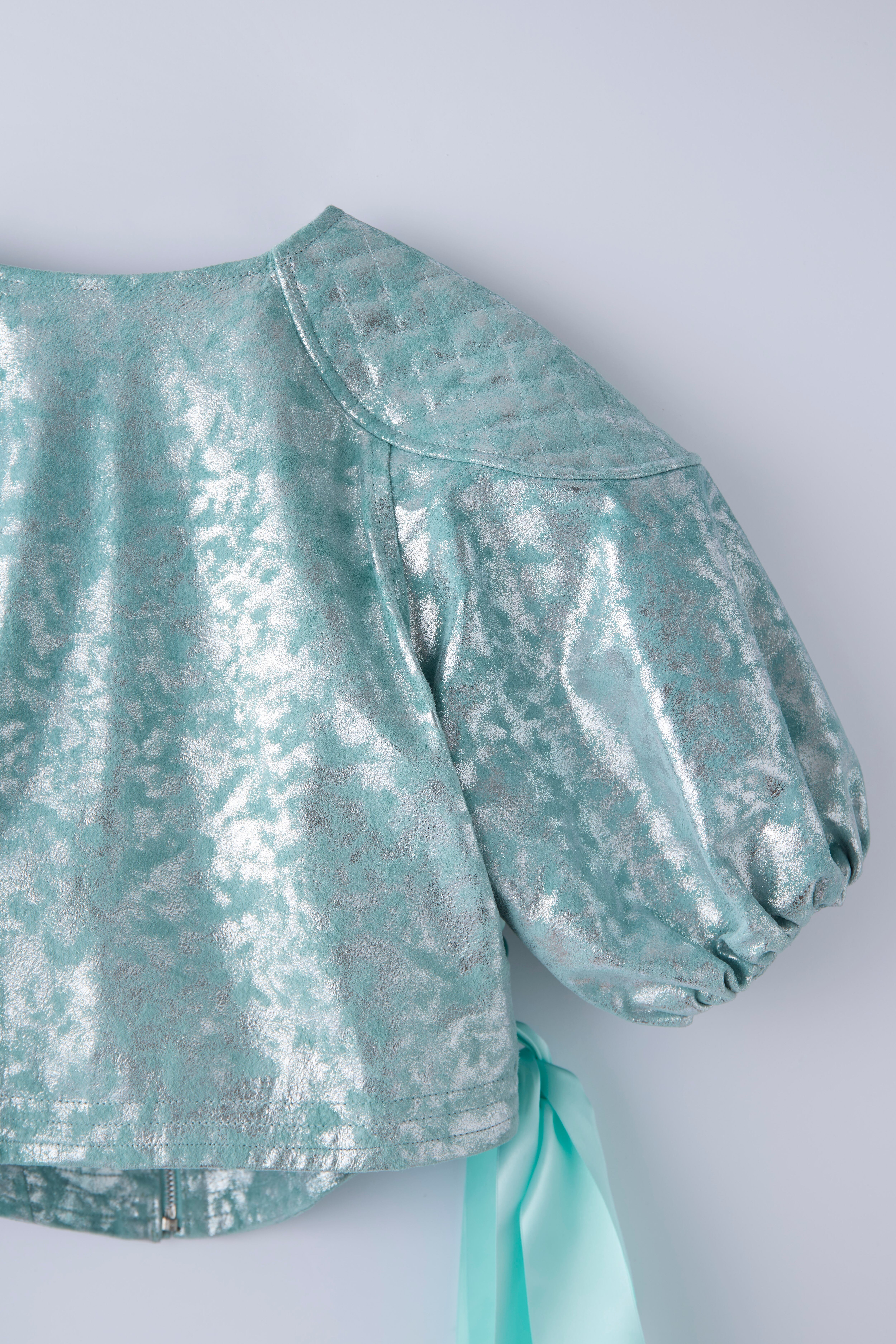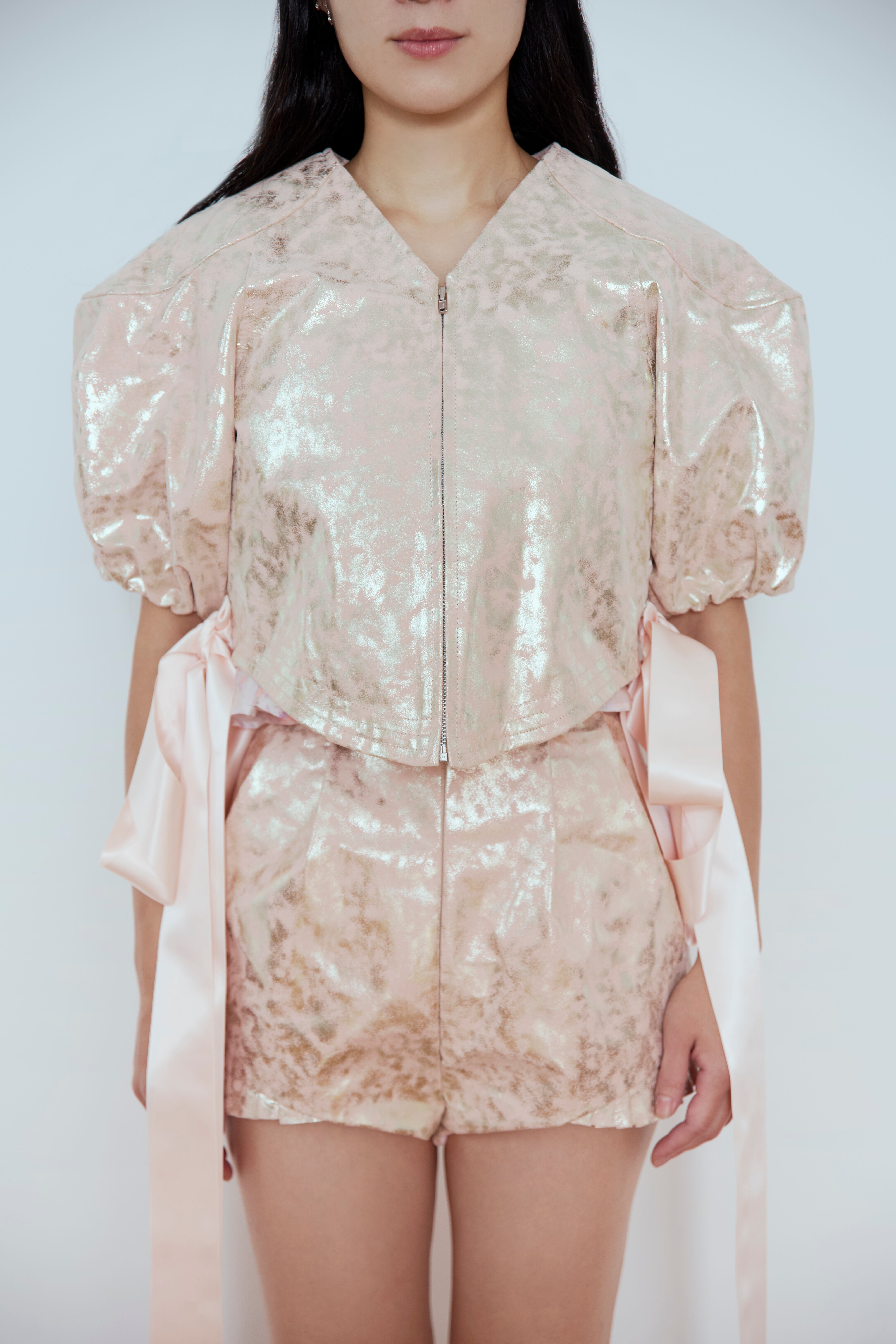 両サイドについた編み上げの大きなリボンが印象的なピッグスキンのショートジャケット。
