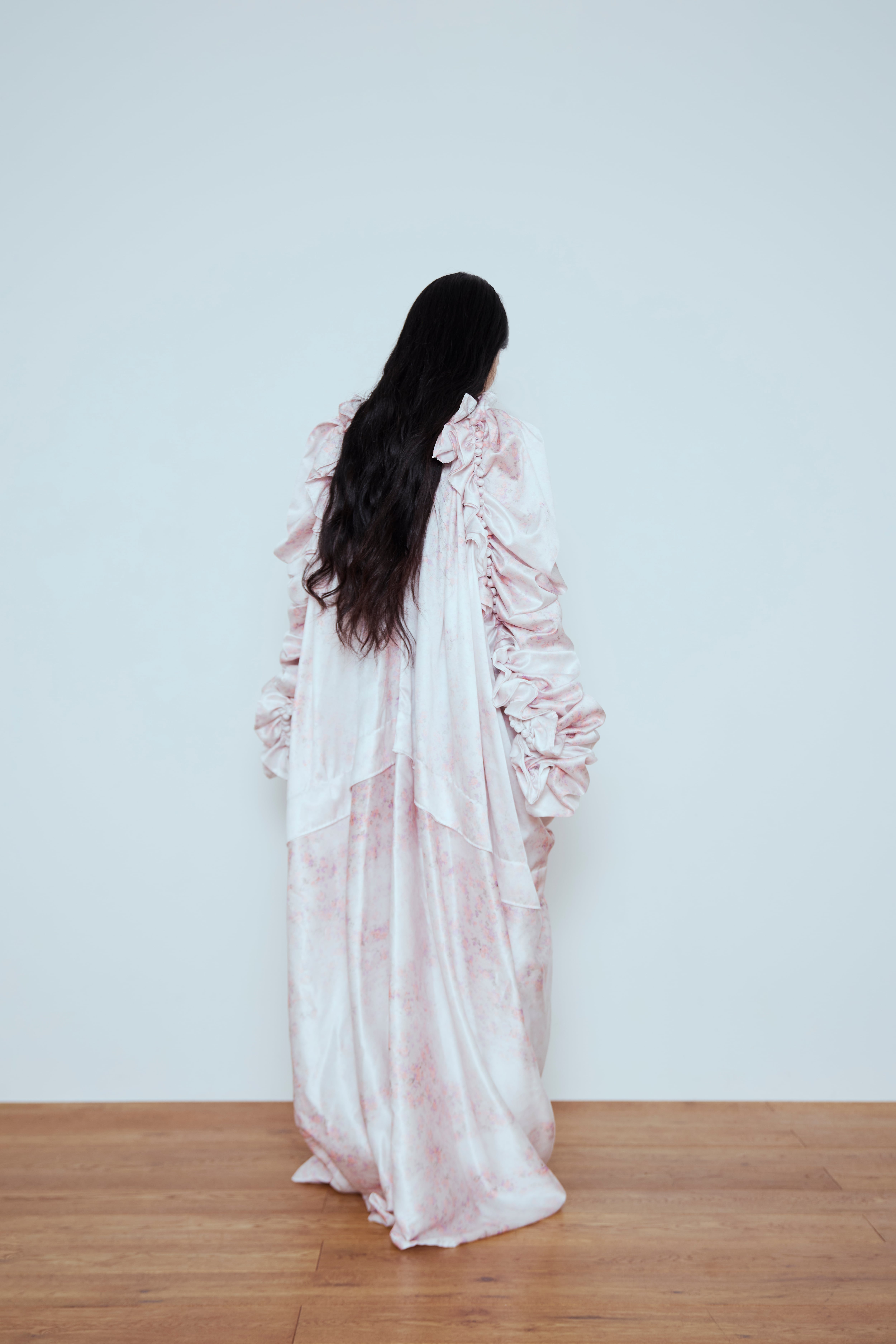 朽ちた花柄の壁紙から着想を得たオリジナルのプリント柄は、フェミニンでありながらどこかノスタルジックな印象。