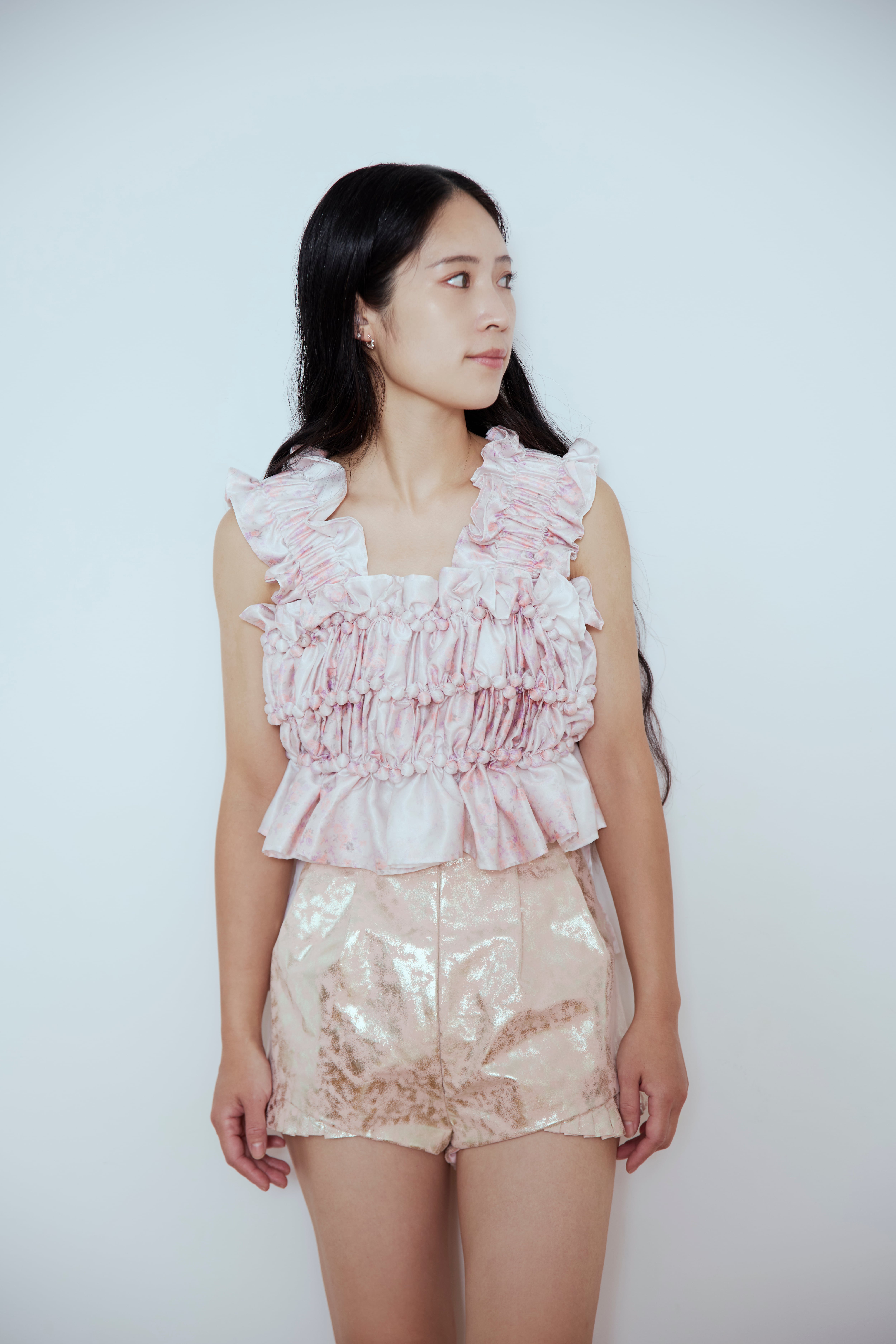 手作業で絞りを施したフリルのディティールが特徴的なビスチェ。