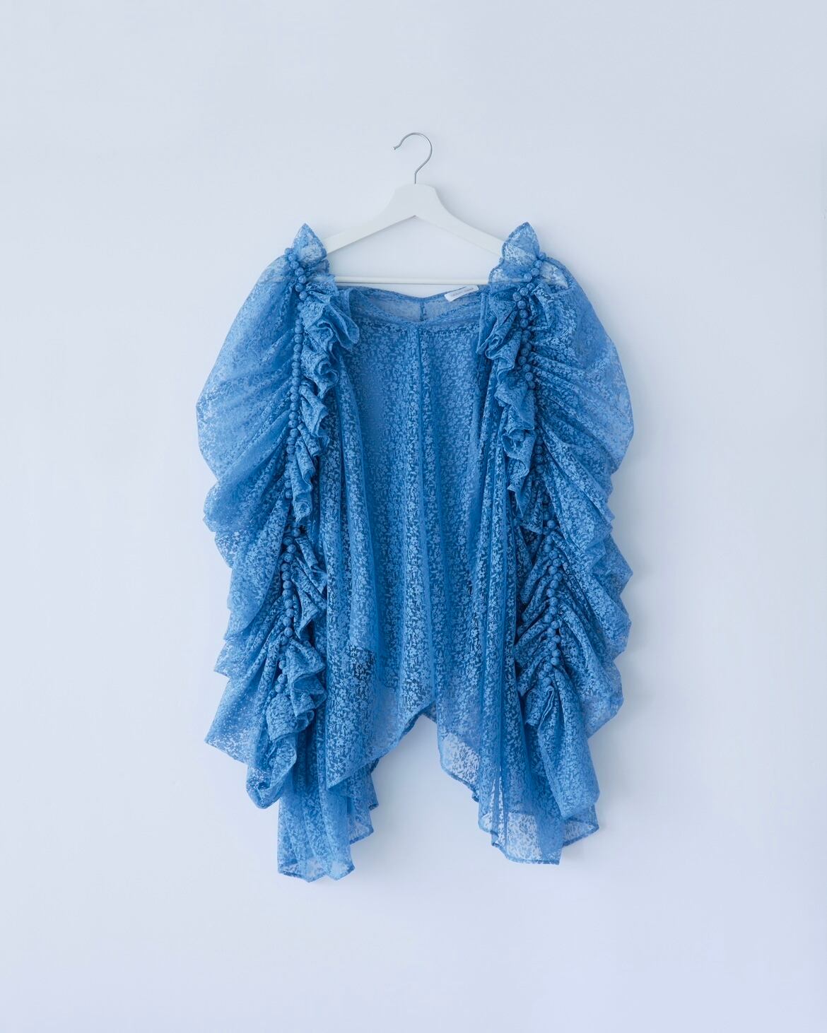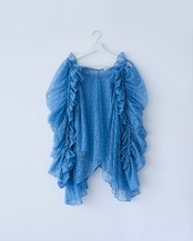 絞りによるギャザーの装飾部分にはカッティングされたアクリルビーズを使用しており、動くたび煌めく華やかなトップスです。